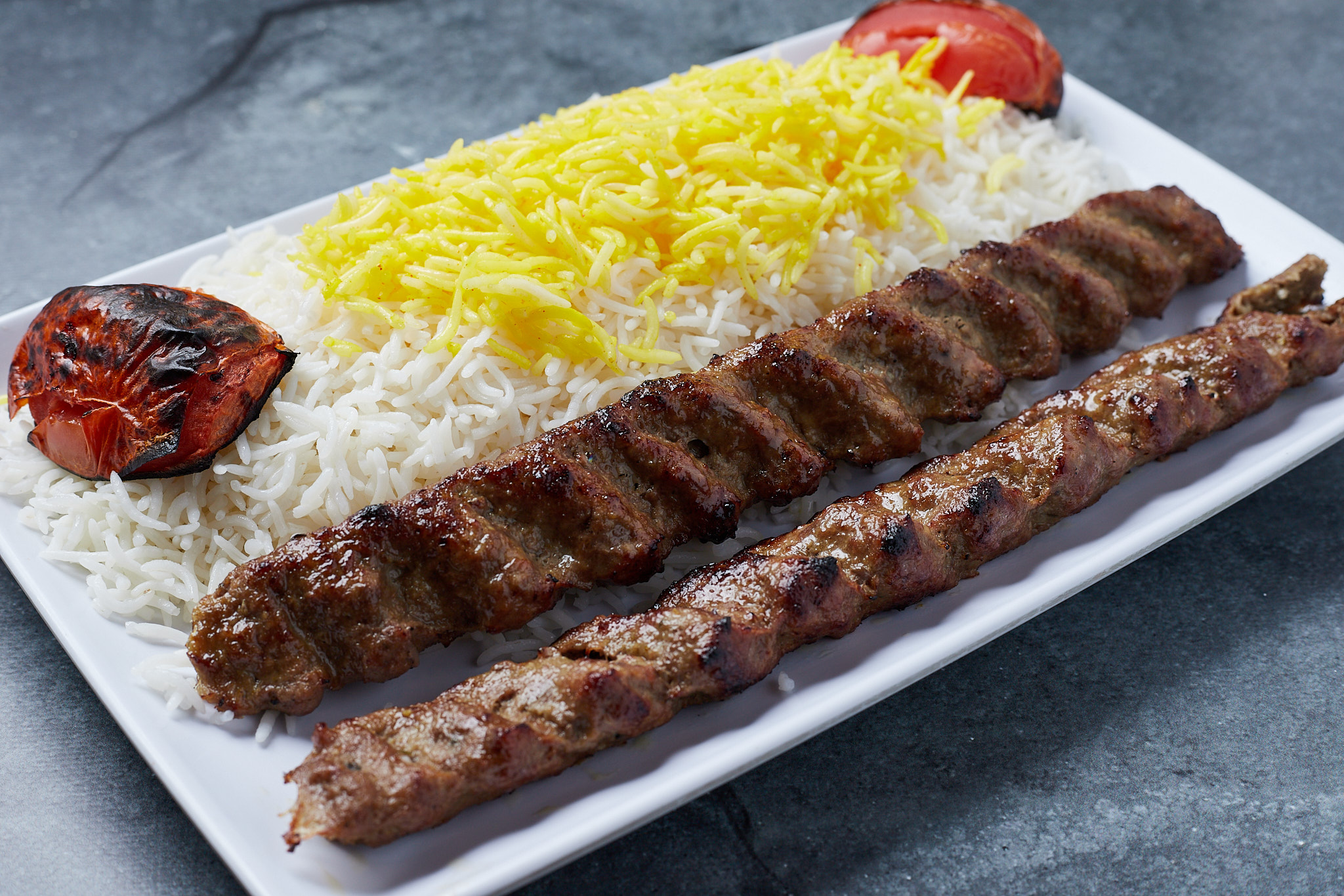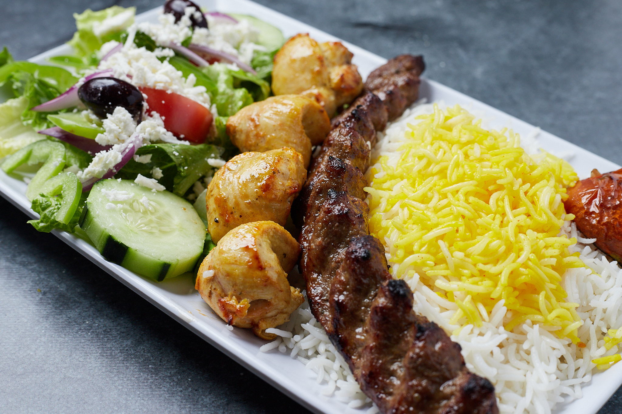 One Skewer of Koobideh & One Skewer of Boneless Chicken Breast.
