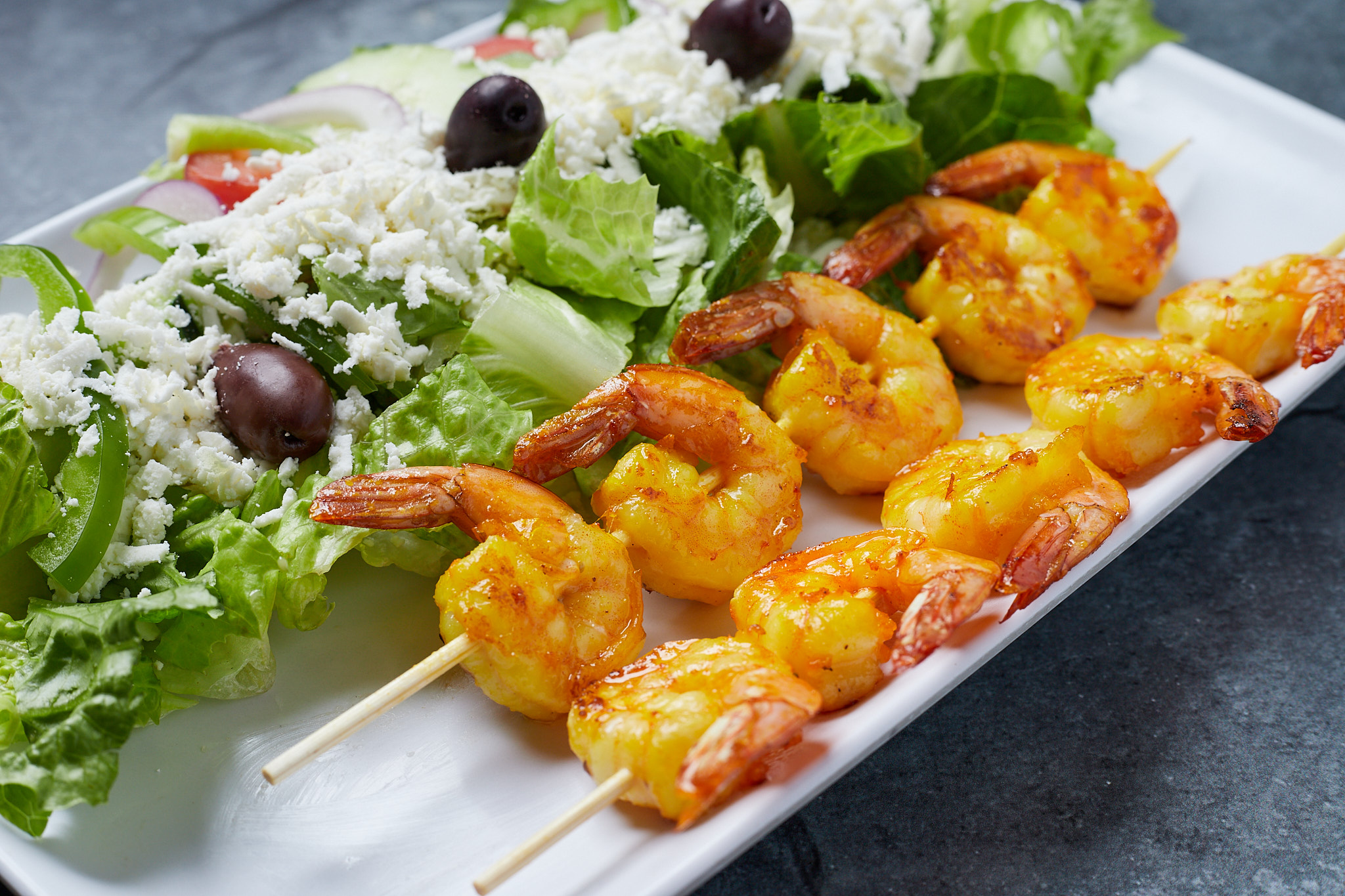 Two Skewers of Shrimp Garlic, Black Pepper, in Saffron Sauce.